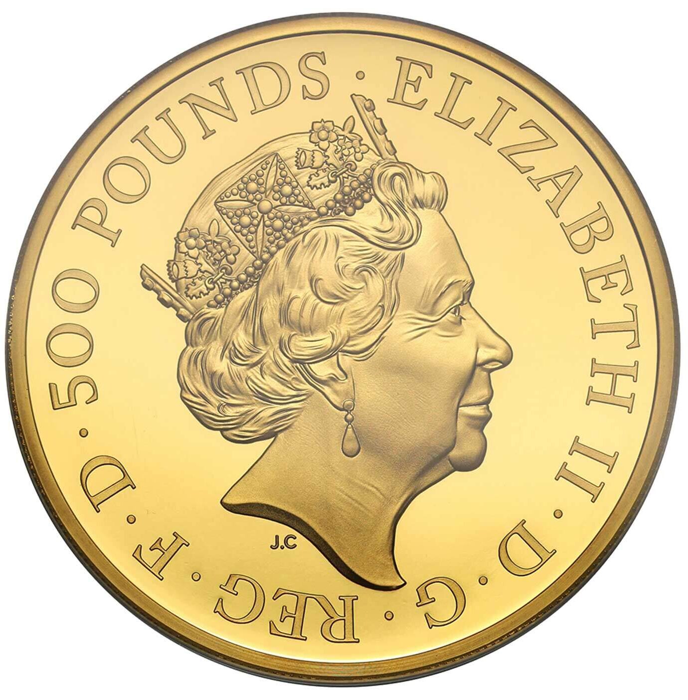 Obverse – Crowned head right, JC initials below for designer Jody Clark, Latin legend surrounding, ELIZABETH II. D. G. REG. F.D. 500 POUNDS.