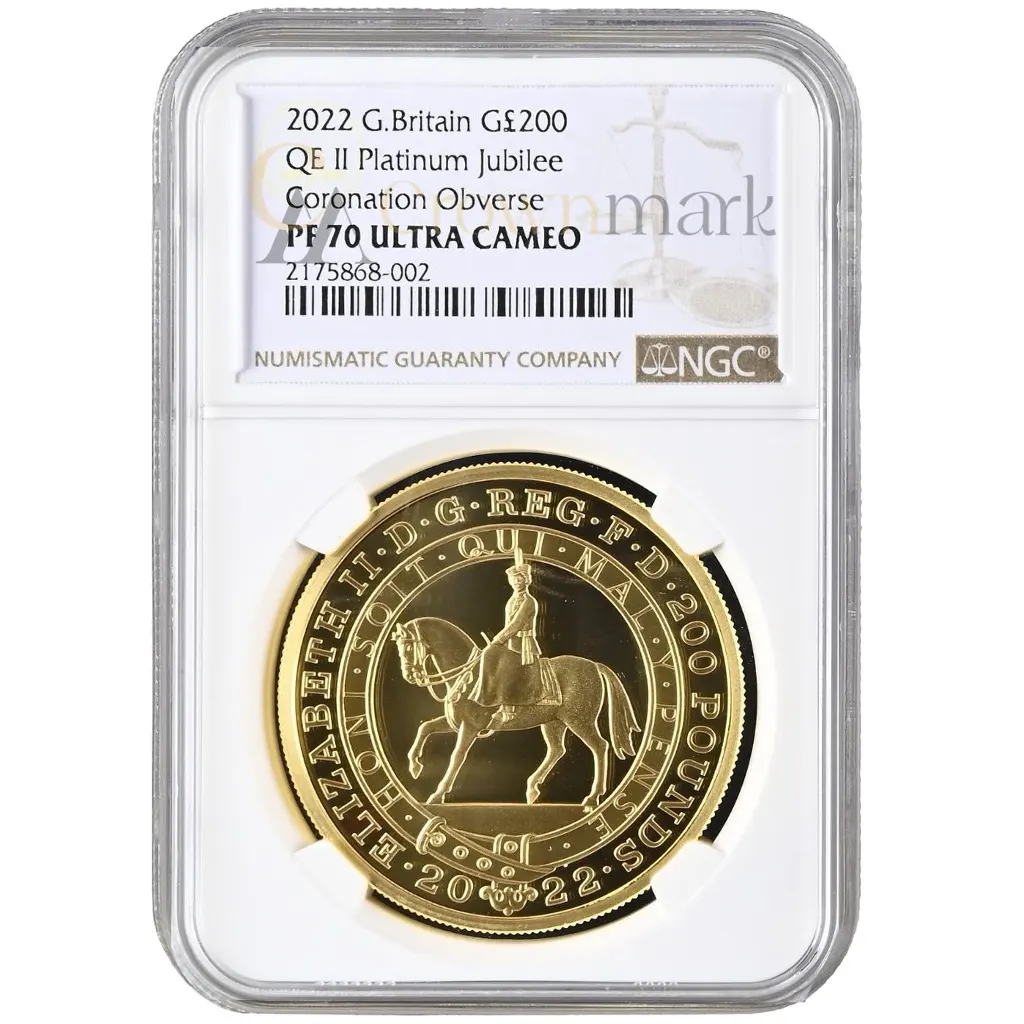 2022 Platinum Jubilee gold proof 2oz coin from The Royal Mint. Obverse: equestrian portrait of Elizabeth II within a garter by John Berghdahl