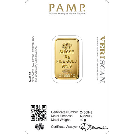 This 10 Gram Fine Gold (99.99%) Bar by leading Swiss refiner PAMP comes with a certificate and matching serial number printed onto the Bar, sealed in a tough credit card sized package for security and convenience.